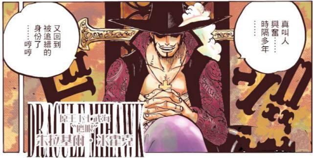 鹰眼。作为世界最强剑士,索隆的一生目标。他的实力妥妥巅峰大将级别,跟四皇香克斯是好友,两人的实力更是不相上下。正因为有他在,七武海才能跟四皇团抗衡,否则想都别想了!以鹰眼的实力,不出动两名海军大将,只会全军复活。面对海军的抓捕,鹰眼是又开心又讽刺。
