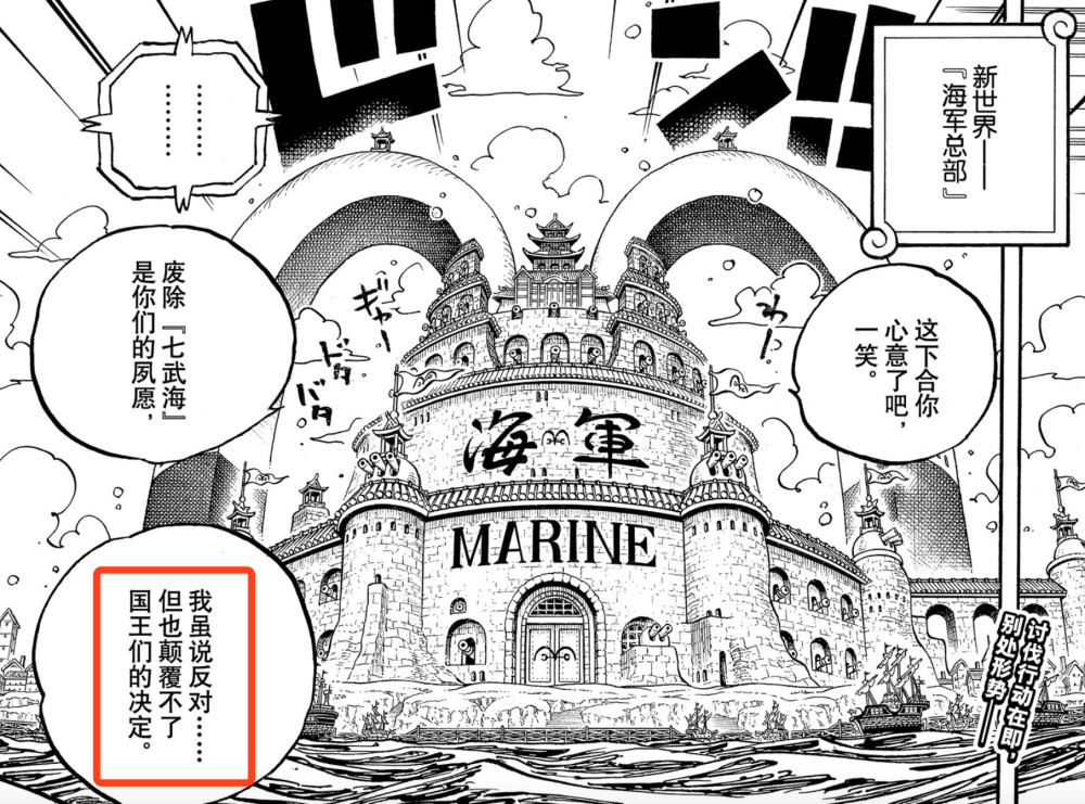 综合上述的信息,我们就能发现七武海制度为什么会被轻松废除,最大的原因还不是国王被欺负,海军掌握更强大的武器。而身为海贼的七武海自然没有用武之地。