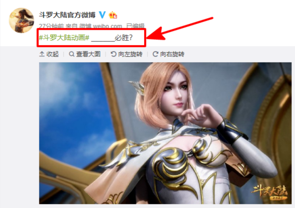 为了增加热度,《斗罗大陆》官方这次也是玩起了“梗”。这里我们可以看到,斗罗官方是出了一道填空题,其实题目很简单,那就是XXX必胜?那么问题来了,到底是谁必胜呢?如果按照小说的走势来看,结果是很明显的,自然是史莱克学院必胜。但是这里的配图却是胡列娜,这用意似乎已经很明显了。由于胡列娜是武魂殿人,更是比比东的徒弟,这是不是在暗示武魂殿必胜呢?