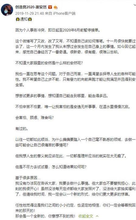 已经达到国内lo圈行业内种草姬的顶峰的谢安然还十分的年轻,因为她决定走出自己的舒适圈,去尝试更多的可能,在2019年谢安然就将自己参加选秀的决定隐晦的发布在了微博上:
