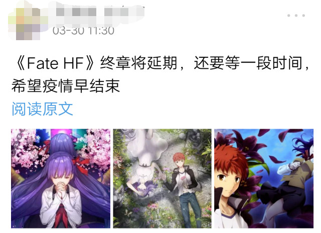 Type-Moon旗下《Fate/stay night》之中以「间桐樱」为女主角的最终路线「Heaven’s Feel」,由ufotable改编为同名剧场版动画。动画预计会分成三章节来推出,前两章节已于2017年和2019年上映,最终章《spring song》原定于2020年3月28日在日本上映。因疫情影响,动画宣布延期至2020年4月25日上映,后再度宣布延期,具体上映时间待定。