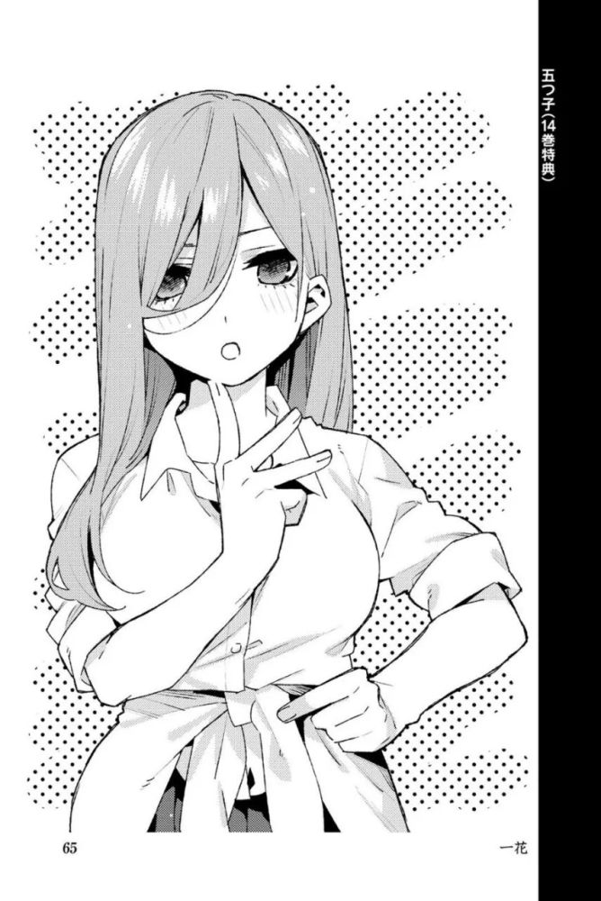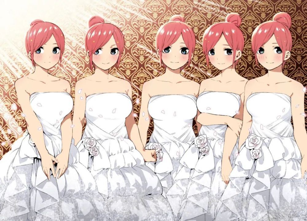 漫画最后一卷14卷好像还没有发行,网上关于14卷特典内容已经传开,不同于13卷特典里中野五姐妹cosplay不同作品里的角色服装,这次是中野五姐妹之间的互换Cosplay,准确来说是互换本体,这个难度是不是比风太郎在婚礼上去猜这五姐妹简单许多呢?婚礼上五姐妹的化妆简直是“炼狱级”,这是许多粉丝第一眼看到这五人时发出的感想:发型、发色、身材与穿着打扮毫无差别的五胞胎站在一起,然后你必须指出一花、二乃、三玖、四叶与五月分别是谁,不然当场离婚(滑稽)。