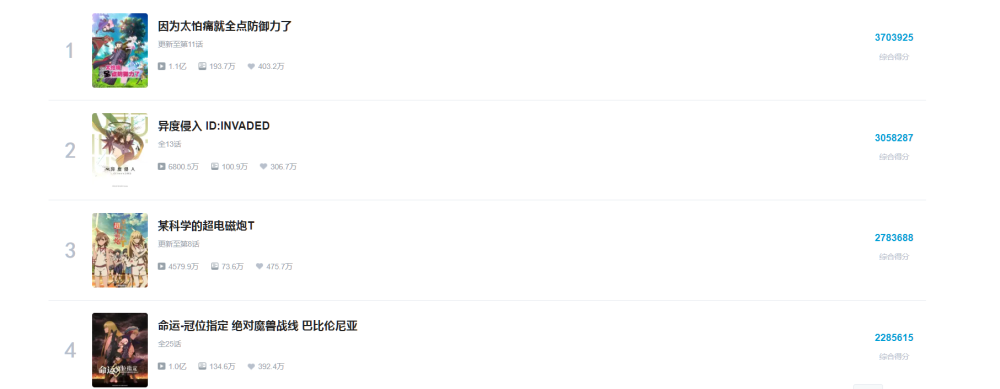 话不多说,由图可知,之前《异度侵入》在1月新番并不看好,排名连前五都没有,可如今却超过了《某科学的超电磁炮T 》,稳居第二(盾娘太强了,不用多说了)。要知道,作为原创动漫能受到这么多的观众的喜爱,真的不容易,尤其起初在还未开播时,很多人就不看好,因为像这类原创动漫没有原作基础以及热度支持,脚本崩盘的概率也相当之大。