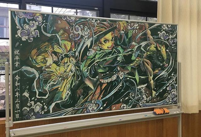 之前日本那边不少迎来中学的毕业季了么(他们那边毕业时间和我们有点差别,各个学校也有可能有差别),那时候就有不少网友看到有的日本学校出了动漫黑板报欢送同学们毕业,其实这其中就有不少这位老师创作的。