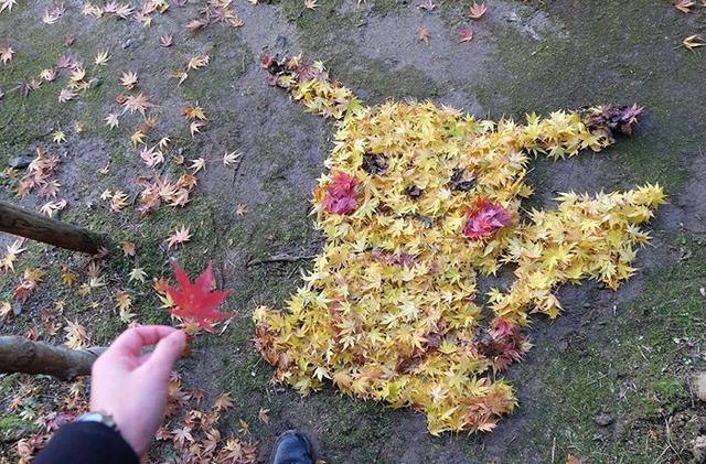 不仅仅是黑板,落叶也成为了他的创作素材,前段时间他们学校红色和黄色的落叶比较多,他就收集起来做了个皮卡丘,太厉害了,果然日本人均绘画高手,更别提这位本职工作还是美术老师了,有这样的创意和情趣,应该也能培养出不少未来的小漫画家们。