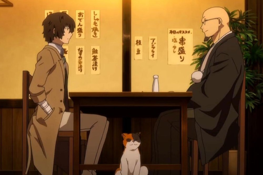 漫画版《文豪野犬》第82话,猎犬的队长福地樱痴在演讲结束后,退出会场时遇到了正在等候他的乱步。这是福地和乱步的第二次见面,他们俩之前在侦探社成立纪念的庆祝大会上已经见过一次。虽然只有那么一次,但已经足以让他们对彼此的认识加深,就有了第二次会面时的互相调