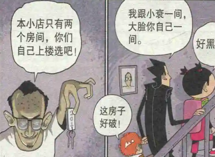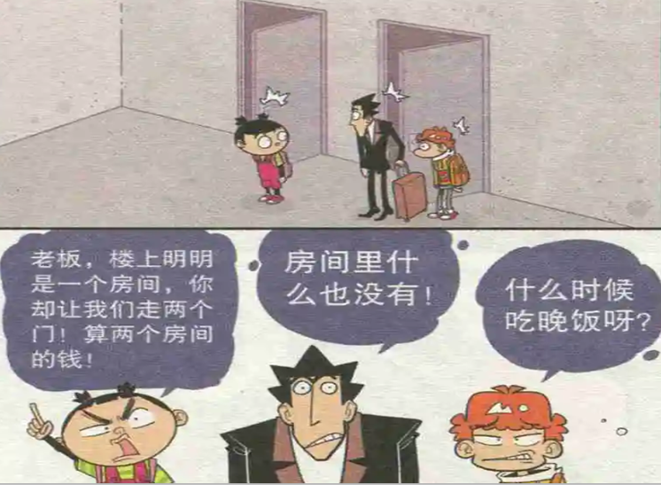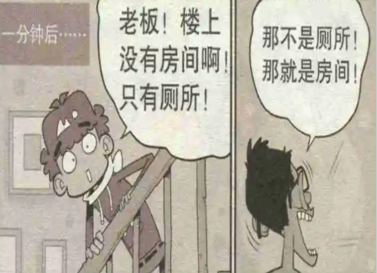 只是在阿衰他们三个人上楼,看房间才一分钟之后,阿衰有跑下楼了,因为在上楼之后,阿衰根本就没有看到酒店楼上有房间呀,只是看到了楼上有两个厕所门,一个男的,一个女的。这个是怎么回事呢?阿衰一脸懵地问着酒店老板。结果老板说了,那是房间不是厕所呢!