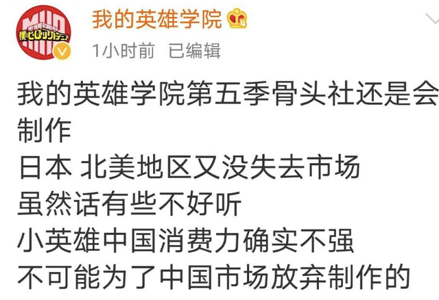 消息一出,很多《我的英雄学院》动漫的死忠粉丝,纷纷在微博下留言,甚至出现了“失去中国这点小市场没什么,在国外小英雄也是很火,这点损失根本算不了什么”的言论。他们话语中得意的样子,似乎打了一场胜仗而已,接下来便是是寻求剧场版动画链接的评论。