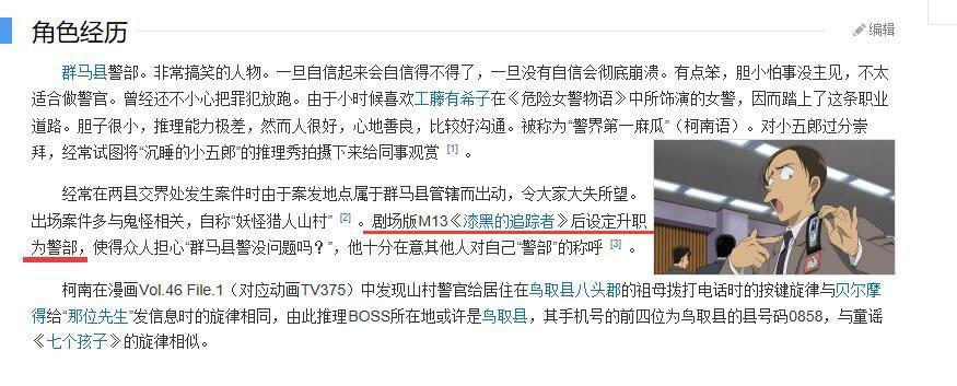 到了后来的TV版262集《毛利小五郎双胞》的时候,也就是我前几天追到的剧集里面,这位群马县的菜鸟警察早已变成了一个经验丰富的警员了,这能力上的提升,不是一丁半点啊, 这就足以证明了一件事情,就是他的破案能力提升上来,这还没完哦!根据我搜索他的百科的时候,发现了一个事情。