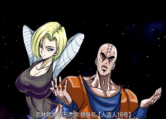 克林作为地球上最强的人类战士,拥有宇宙最强的赛亚人孙悟空作为朋友,根本没有人敢欺负这个光头克林。克林最成功之处不是因为认识最强的赛亚人,也是娶了一个漂亮的人造人18号作为老婆。如此幸运的克林也逃不过画师对其JOJO化,光头之下的JOJO版克林无论是眼神还是表情完全复刻JOJO里面的角色,他的替身名“人造人18号”。