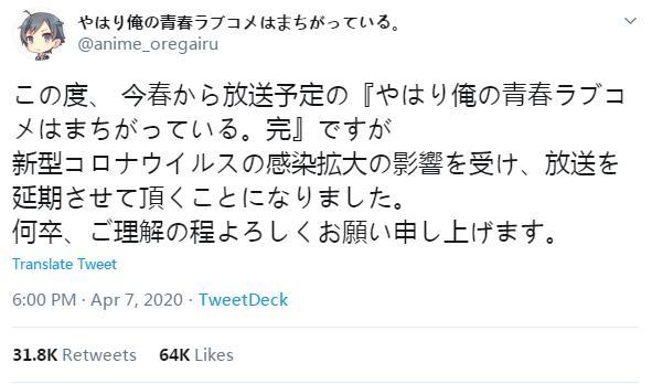 原定从今年春天正式播出的《我的青春恋爱物语果然有问题。完》,由于受到新型冠状病毒感染扩大的影响,动画播出延期。 希望能得到各位的谅解。