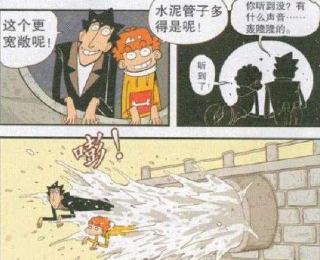 很快阿衰就带金老师来了,说水泥管多得是,而且这里还宽敞呢!就在阿衰跟金老师还在喜悦中的时候,怎么就听到了好像有什么声音轰隆隆的传来一样。最后阿衰跟金老师在还没有反应过来的时候,就直接被大水给冲走了,原来这里是排污口呢,看着阿衰跟金老师狼狈的样子,真的好可怜啊!