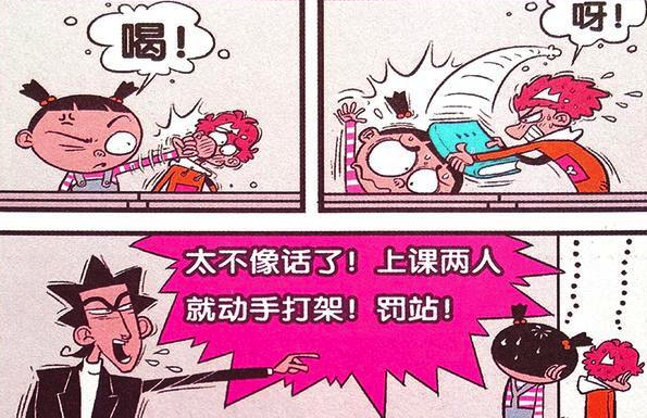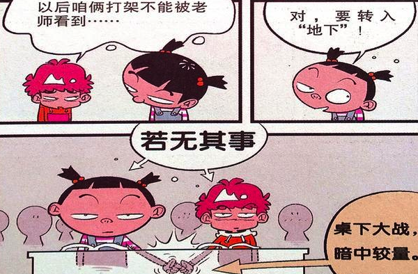 同学之间本应该和睦相处,毕竟天天抬头不见低头见,就算你做不到强颜欢笑,起码也要保持应有的礼仪。阿衰和大脸妹根本就没想到这一点,他们把“战火”转移到了桌子下面,任凭老师在讲台上讲得唾沫横飞,他们都不闻不问,只顾着自己的私人恩怨,真是虚度光阴呀,要是他们的父母知道他们花了钱来这里是为了斗气,估计都要气晕过去了。