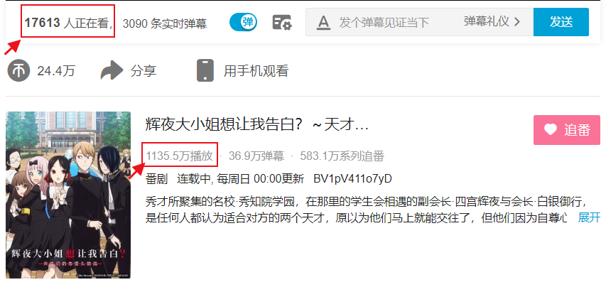 《辉夜大小姐》第二季虽然在四月迟迟没有出场,但主角总是最后才出场的,一开播播放量便以惊人的速度暴涨,到仅仅一天时间播放量便超千万,创四月新番播放量最高纪录,而且线上人数一直不低于1.5万,说实在的第一话,一天时间竟然如此强势的创造这样的成绩,果然这才是四月新番中的超强大