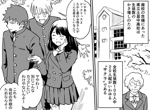 近日一位日本喜欢绘制短篇漫画的作者,其新作品引发了大规模热议,因为噱头十足而且题材很有意思,主要是让人联想的内容很丰富,其主题核心很明确,就是亲妈变身女高中生,亲爸女装拯救学校,因为是短篇漫画一共就2页,这里带来具体的说