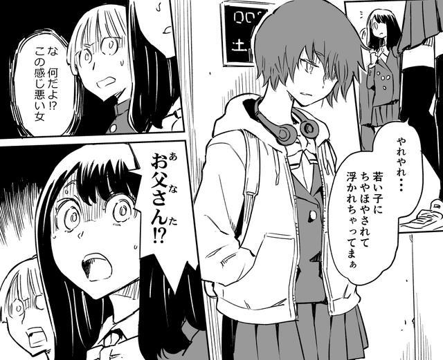 结果被一位看起来打扮很不良的JK少女嘲讽了,表示:真是的,被年轻人夸几句就开心成这样的。男主好友一开始还吐槽:这妹子怎么看起来感觉很不良少女。结果妈妈的下一句话让人震惊:孩子他爸?!