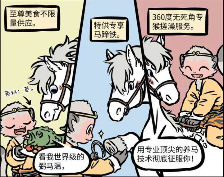面对敖烈如此不友好的态度,悟空决定一定要征服这条龙。于是大师兄用各种美食、马蹄跌以及当弼马温时学到的养马技术收买敖烈。