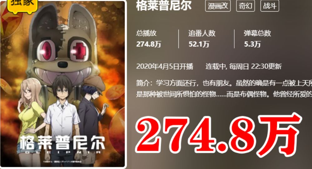 在第二集开播后一天老白看了下B站播放量,目前两集播放量才274.8万,虽然播放量还在增长,但速度比较慢,比起其他新番低很多。本来这部新番蛮好看的,尤其是战斗和F利相当多,但因为B站打码操作,让一群漫迷不再来B站看正版的《格莱普尼尔》,纷纷跑去看盗版无修动画,因此导致播放量相当低!