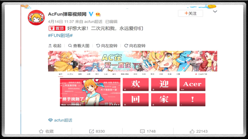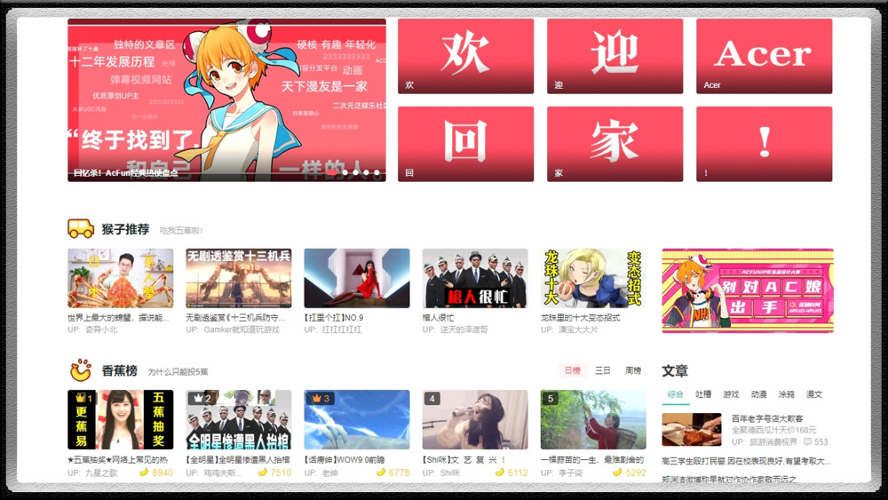 A站的官网页改成了“欢迎回家Acer!”的字样,这对于漫迷来说是不是很感动呢?因为A站确实是国内第一家以二次元文化著称的网站,B战后来转型成功超越了B站而已,就连B站自豪的弹幕文化最早其实也是A站的产品。