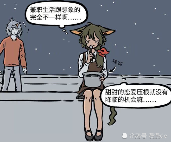 伤心的她跑到房门上吃东西,在心里面吐槽根本没有机会遇到甜甜的恋爱,正在哭泣的时候,哮天犬从后面出现了,他看见瓦猫正在伤心的吃稀饭,心中莫名的心疼这个女孩子,于是就做了一件很浪漫的事情。