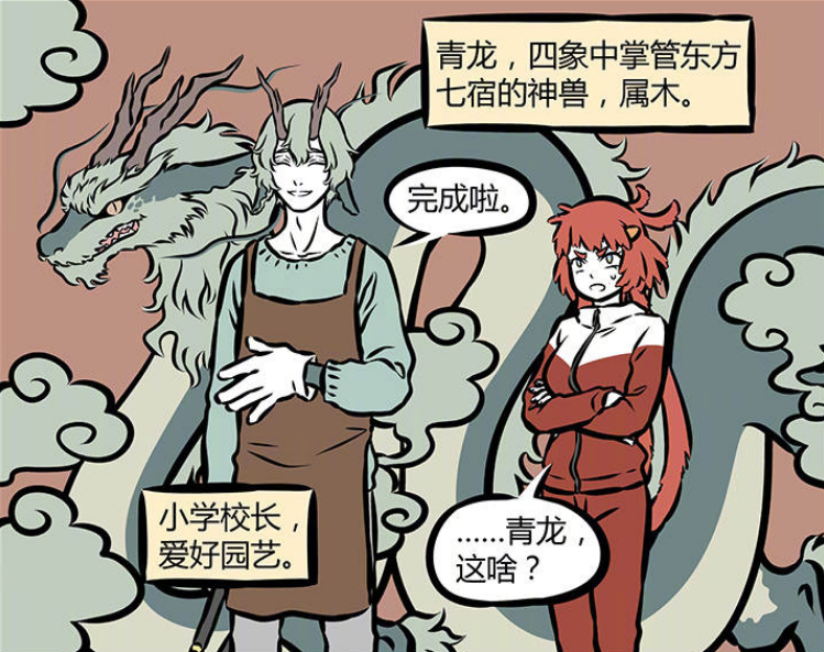 非人哉中四象青龙,五行属木。朱雀是一名体育老师,而青龙则是学校的校长,也是哪吒等人的校长。作为校长的青龙是一位和善的大帅哥,当然他还有一个属于自己的绝活,那就是园艺。因为青龙十分喜欢植物,所以他的园艺技术也练到了数一数二的地步。