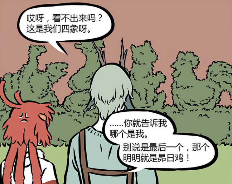 这天青龙就向朱雀展露了自己的园艺绝活!四象被青龙栩栩如生的雕刻了出来。依次是玄武、青龙、白虎。不过第四个朱雀怎么看都不像自己。朱雀生气的说:“你告诉我,最后一个那个明明就是昂日鸡!”朱雀说的没错,最后一个挺像一只大公鸡,根本不像朱雀。也难怪朱雀会生气了。