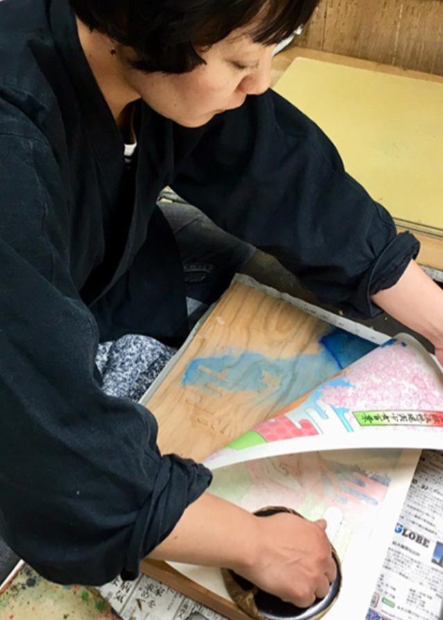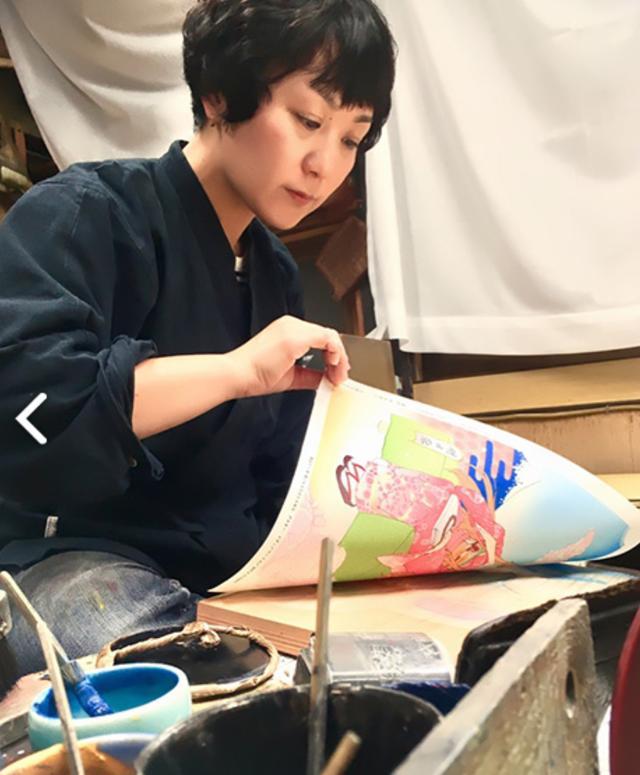 版画完成后,再交由摺师来处理,摺师的工作就是为版画上色,要花好几天时间才能一点点把色彩印上去。明日奈的盛装鲜艳的红色,蓬松的头发质感,鲜艳的天空渐变,都在精心的制作下,复现在木板之上。为了表现明日奈凛然的美丽和可爱,摺师会分使用反复刻印,最终消费了15版木板,经过67次的反复刻印,最后才获得了柔美可爱的明日奈的形象。而用到的日本纸也不是一般的日本纸,而是越前日本纸,这是一种最高级的日本纸。
