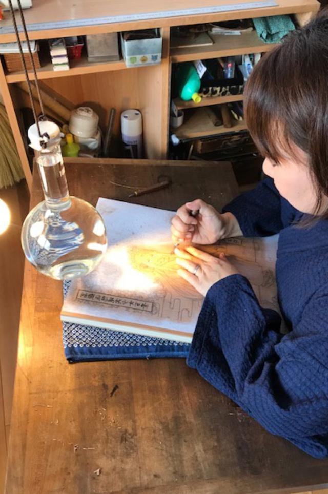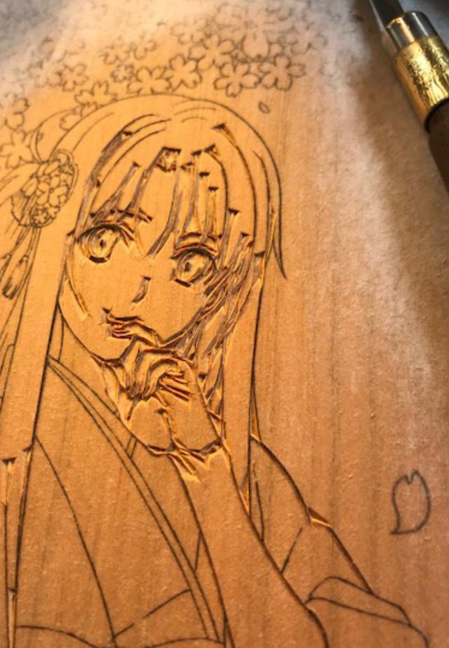 首先,将角色设计的原稿交给雕刻师,在不同的木板上作画,一共雕刻了15块版画。雕刻家菅香世子运用了女性独有的审美视角,精心地雕琢出了亚丝娜的神态,这是传统浮世绘版画,和二次元结合的一步。木刻由山樱桃树制成。这是一种珍贵的木材,质地坚硬,也没有膨胀和收缩的问题。这对于追求精益求精的浮世绘来说,是必须的。