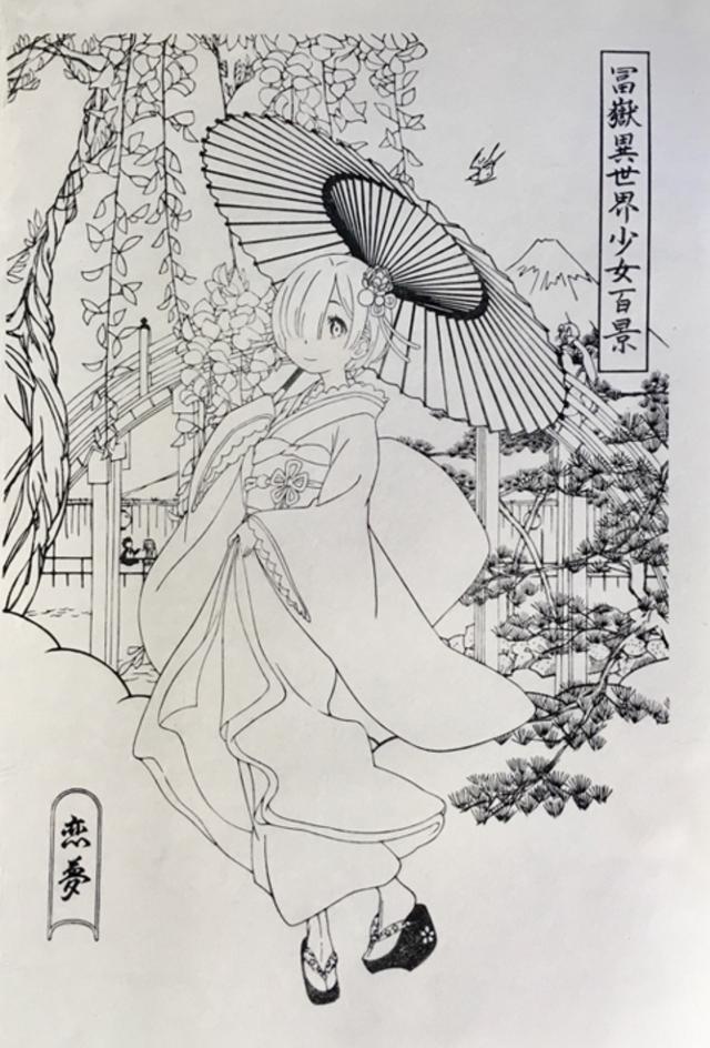 上面那张黑白的绘图就是动画师的原稿了,由《Re:从零开始的异世界生活》的角色设计坂井久太氏完成,继续由上述的两位雕刻家、摺师完成版画的创作。