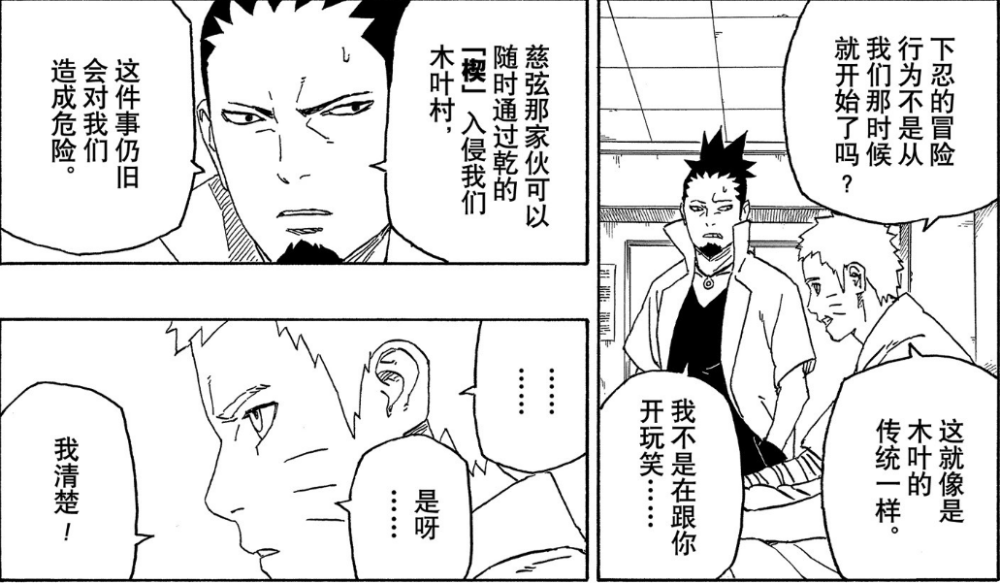 鹿丸和正在病床上鸣人解释这一次是博人和川木他们把他救回来的,而这一群孩子还只是下忍就击败了博罗。鸣人还吐槽了下忍的冒险是木叶村的传统。调侃归调侃,鸣人很担心慈弦会对木叶村再度用楔来进行入侵。
