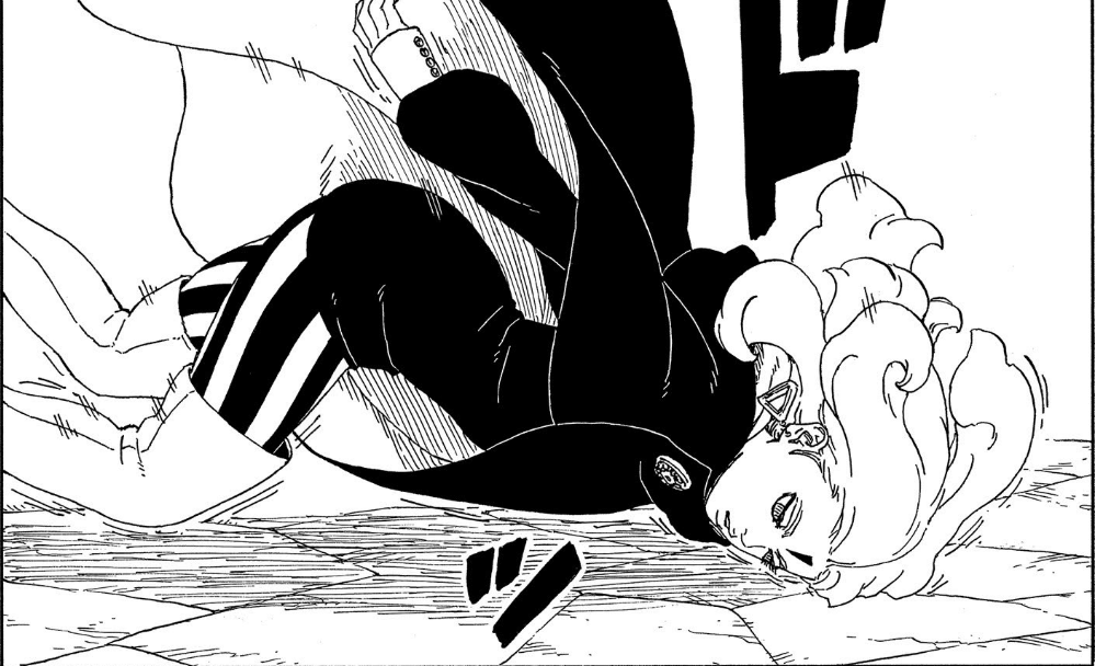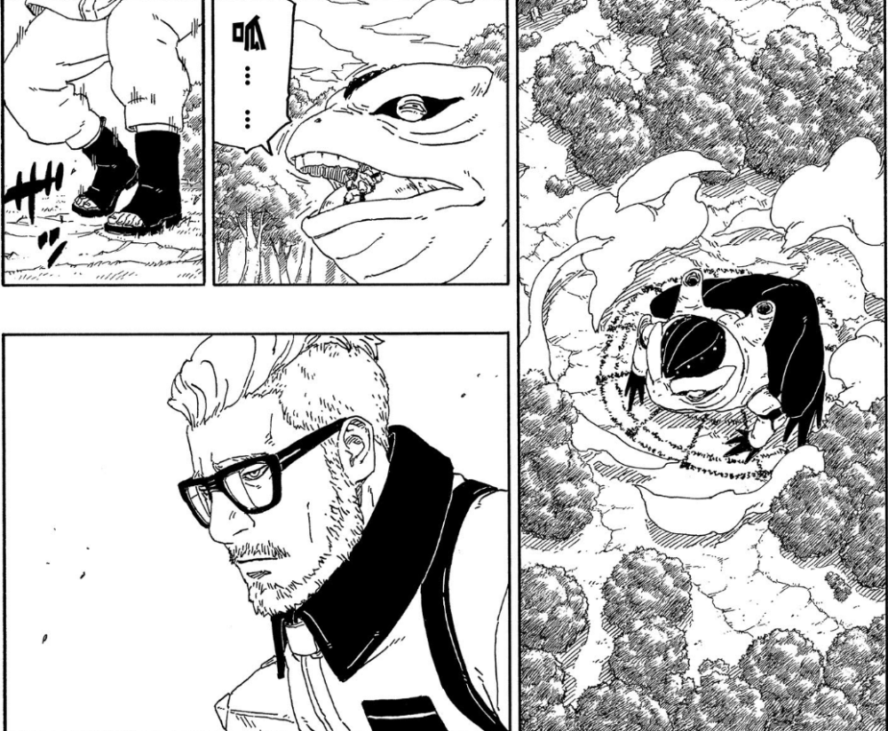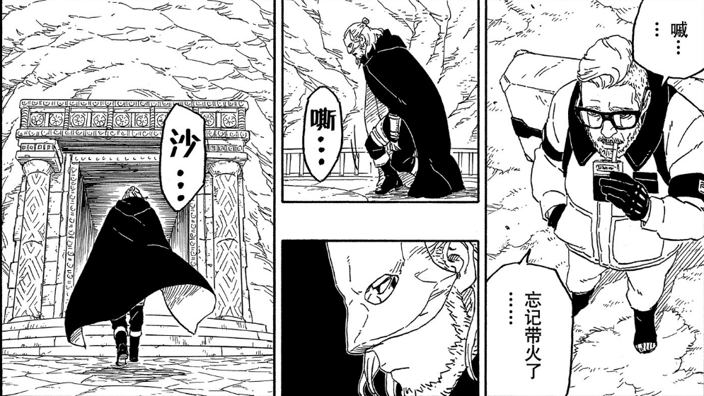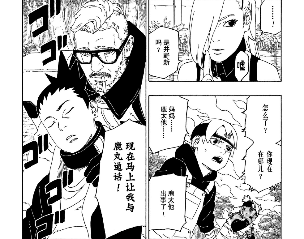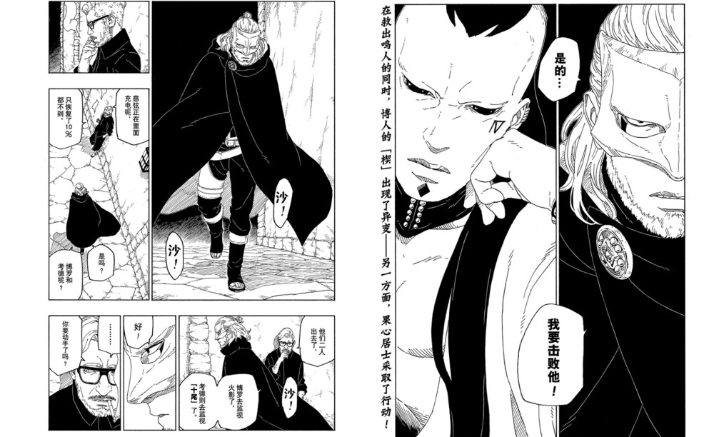在上一话博人传漫画的剧情中,佐良娜在经过川木的提醒之后成功找出了壳组织成员博罗身躯内核存在的地方,用千鸟抓出核并且粉碎掉核之后博罗的能力暴走变成了十分巨大的怪物模样。博人和川木成功救出鸣人之后,遭受到了博罗的袭击。
