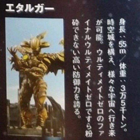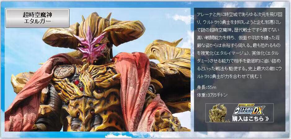 先介绍一位反派——艾塔尔加。超时空魔神,使命是封印奥特战士。史上最强敌(后面反派都是这样……)