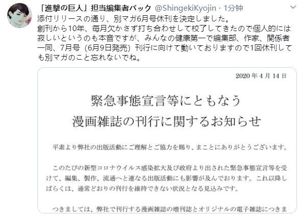 也就是说,此前谏山创连年无休,连续更新了128个月。如果继续更新下去,说不定谏山创还能创造个什么连载记录,可如今这一切都被疫情打乱了。漫画连载是一个系统工程,即便谏山创本人有心继续连载,也得产业链上下游的从业者全部配合才行。很明显,这是不可能的,所以创哥只能“被休息”了。