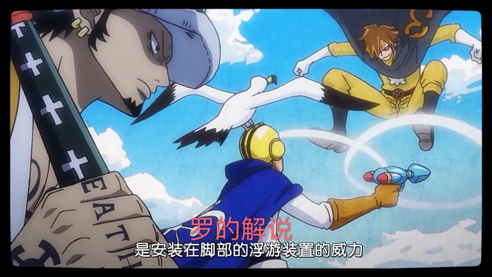 之后罗便开始了自己的解说之路,弗兰奇与佩吉旺等人见到山治能悬浮在空中特别的好奇。罗介绍那是战斗服特有的科技力量,是安装在脚上的浮游装置起的作用。