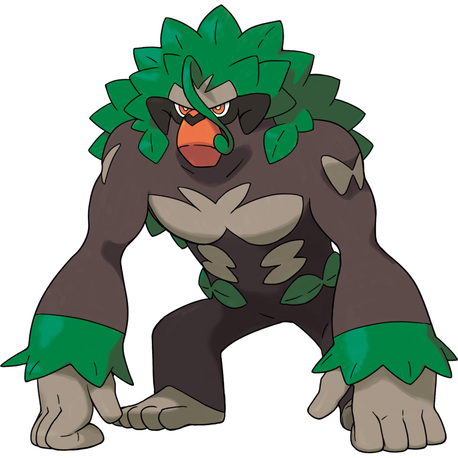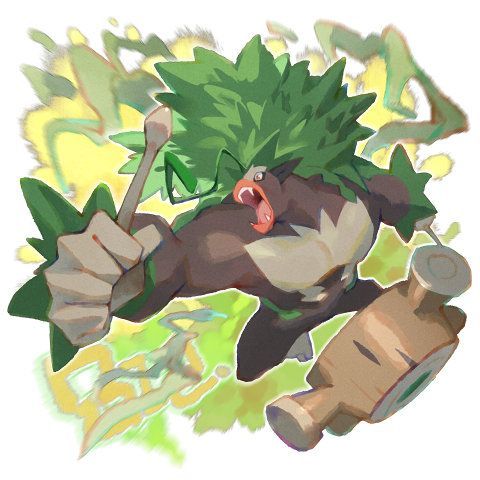 啪咚猴的进化型可以说能够感觉到设计师的恶意,不同于千面避役和闪耀王牌逼格满满的名字,轰擂金刚猩这个名字着实有着杀马特的感觉。这个形象嘛,更是体现了这种感觉,醉心于音乐的狂人体色转变成黑色,因为过度专心而忘记打理的头发很像隔壁赛亚人有没有,头顶的那一撮毛更是野性十足。至于他的木棒也变成了两根打击棒和一个树桩,轰擂金刚猩使用它们可以打出类似于架子鼓的音乐。好吧,确实一个可爱小猴子变成狂野大猩猩实在是让人接受不了。
