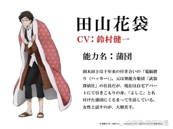 田山花袋是武装侦探社的前职员,与国木田独步的关系较好。所以,有时国木田摆脱的事情,田山花袋也会帮忙。说到这个人物,必须要说一下他的异能,田山花袋的异能是“棉被”,能力效果为能在不触碰的情况下操纵视线内的电子设备,处理速度是常人的几十倍。但必须裹着棉被,并达到身心最舒适的状态才能发动能力。