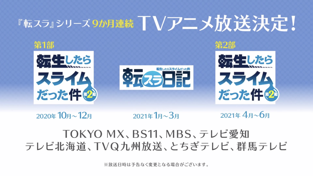 除此之外,官方特意将第二季分成了两部分,第一部分将在2020年10月至12月放送,第二部分则是在2021年4月至6月放送,第一部分和第二部分期间还会插入一个外传《转生史莱姆日记》,在2021年1月至3月放送,让大家解解馋。