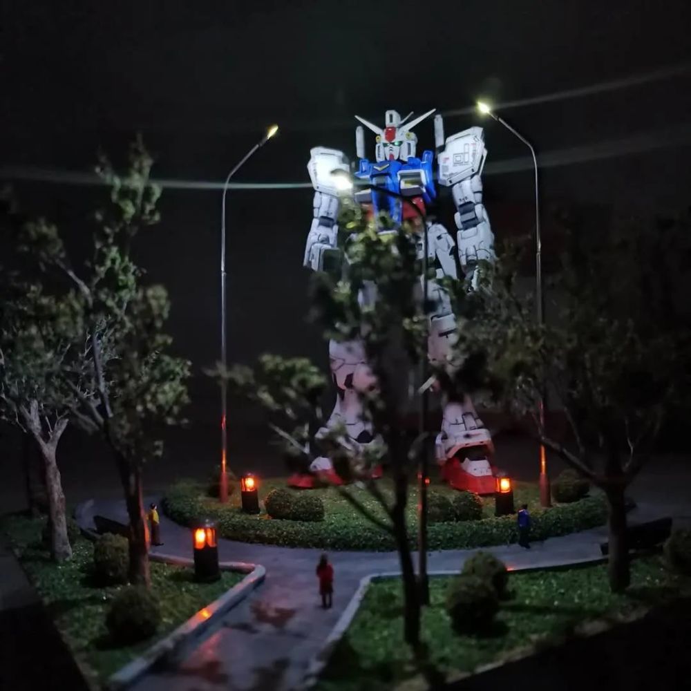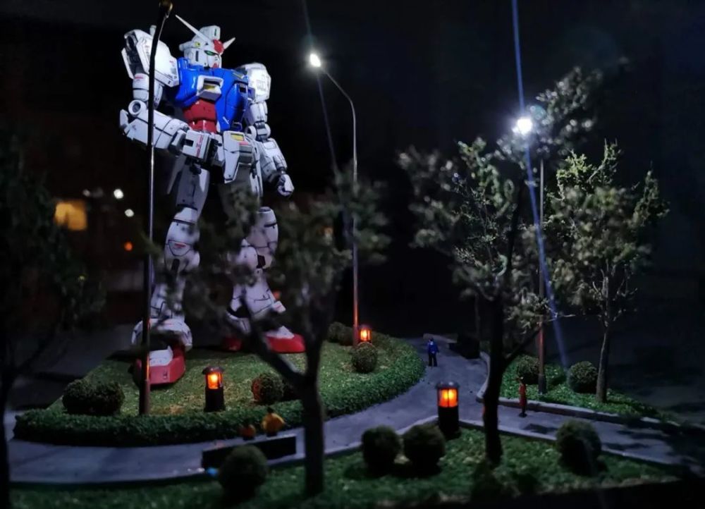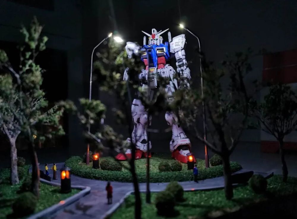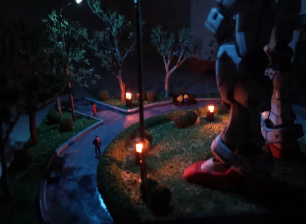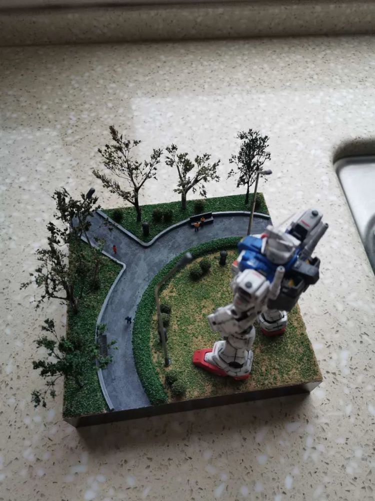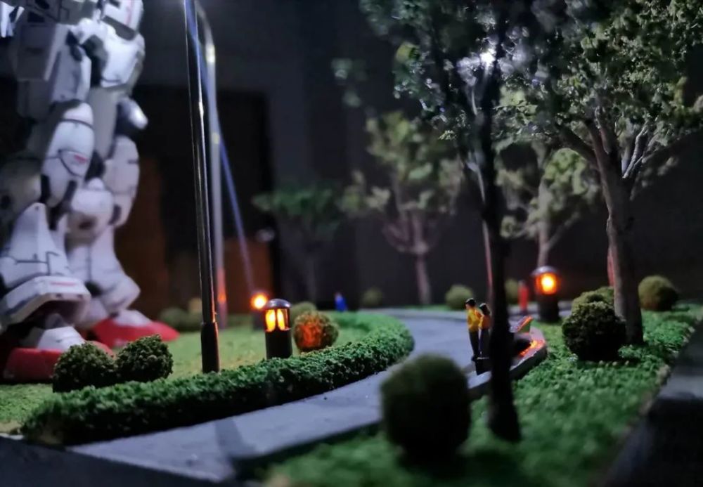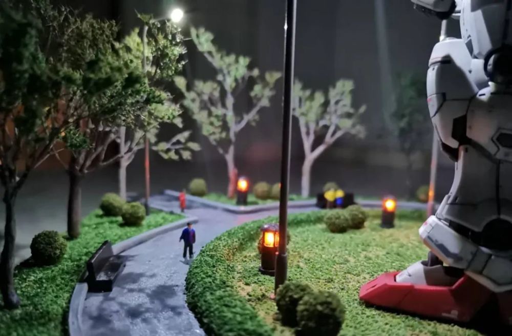 最赞的是地台上超比例高度的两个路灯,通常在小公园这类的场景内现实生活中是不会存在这么高大的路灯的,但这两个高高的路灯不仅为场景提供了足够的照明,又能完成对高达作品的补光效果——神作之笔!