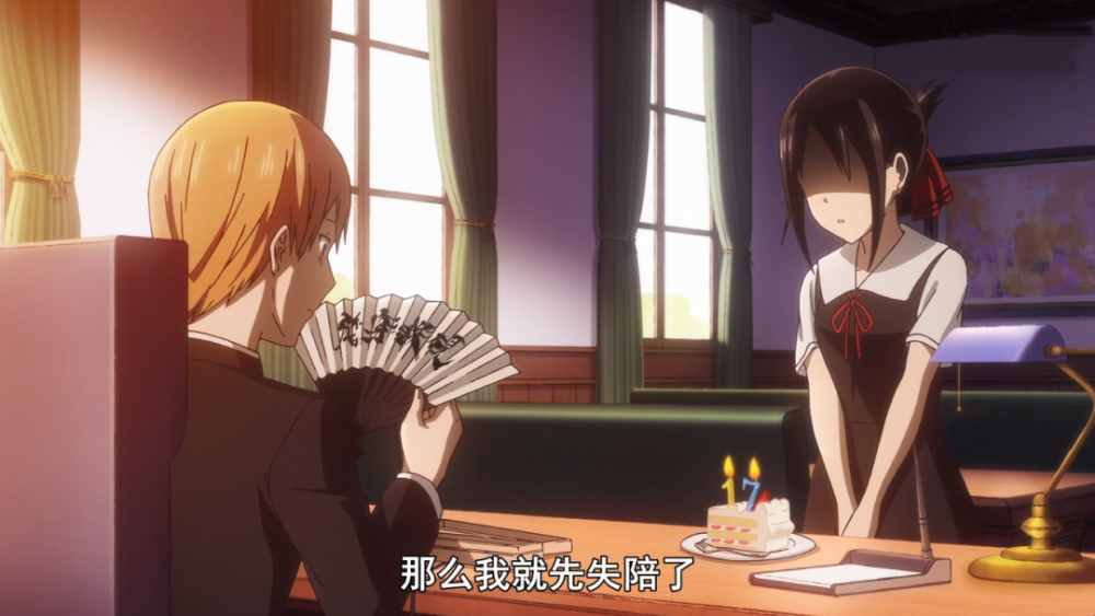 等到白银生日到来的那一天,辉夜准备拿出蛋糕,才意识到自己干了蠢事。因为这个超大号的蛋糕,好比倾注着满满的爱意,就如同用蛋糕来向对方求婚一样。在经过脑内的一番思想斗争与纠结后,辉夜最终还是决定A上去。学生会房间的气氛也因此顿时甜蜜起来,辉夜切下一小块的蛋糕,并将它与一把由自己题字的扇子当生日礼物,送给了白银。