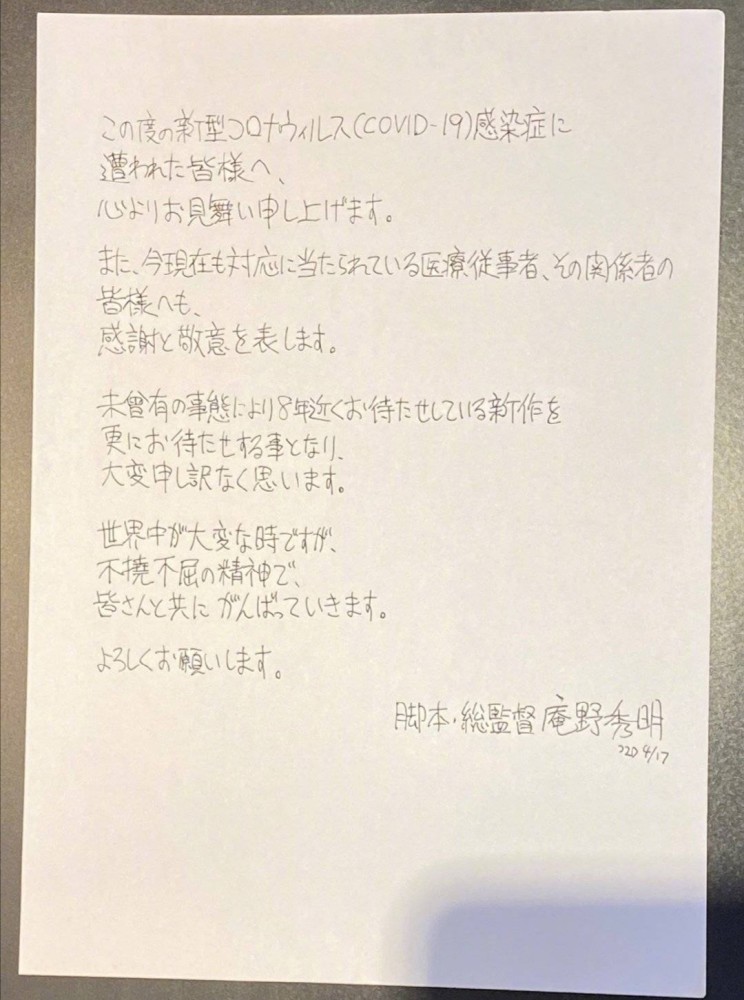 庵野秀明的这封亲笔信一公布,就立刻火了起来。很多日本粉丝过了一把侦探瘾。面对剧场版延期的消息,粉丝们肯定也会觉得遗憾,而庵野秀明的这封亲笔信就显得格外厚重。