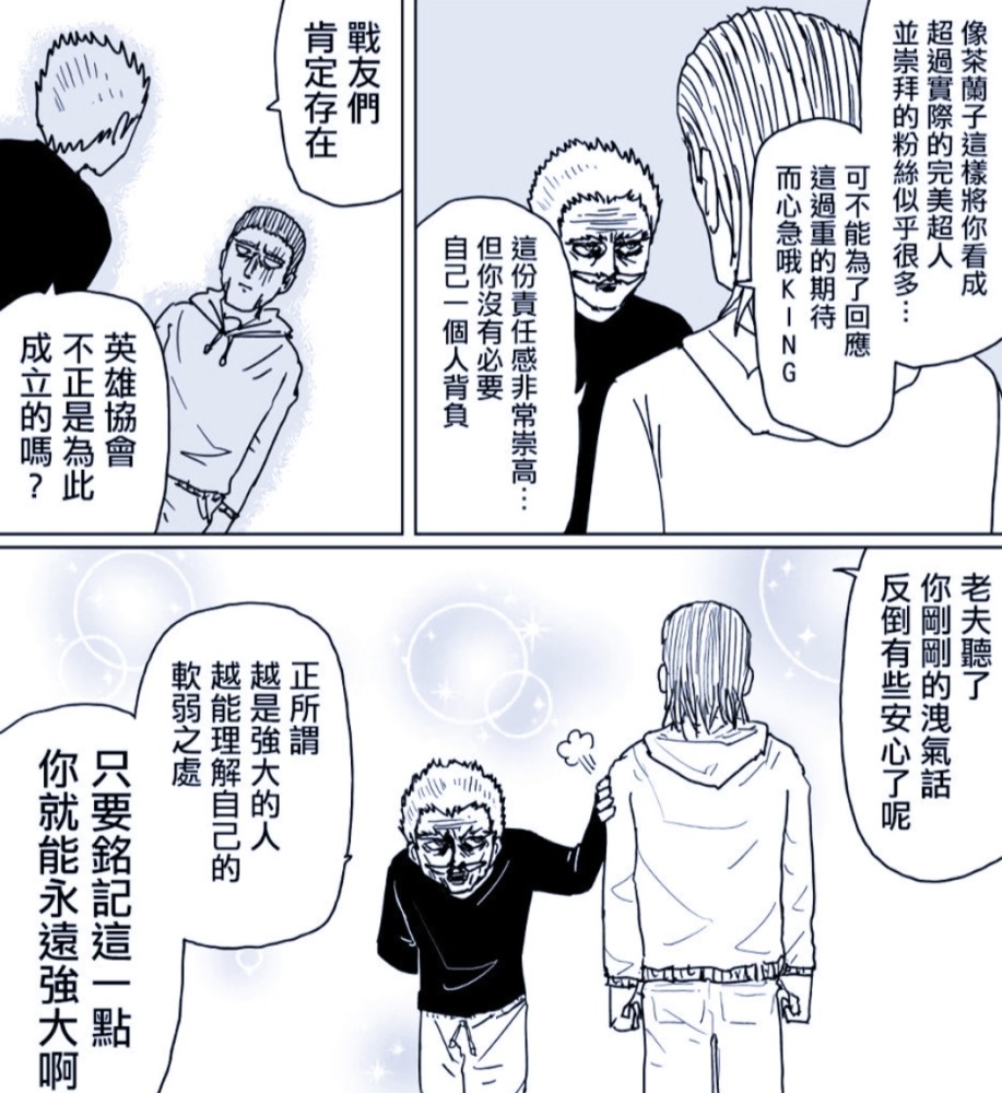 在一拳超人中,有两个人是无敌的,一个是埼玉,另一个就是拥有「召唤埼玉」外挂的地表最强英雄King了。有趣的是,在经历了怪协一战之后,King认清了自己不能够再这样继续下去,决心要变强。只不过King明明知道埼玉的强大,却选择了邦古,让他提升自己的实力,但是最后被拒绝了(笑),看来King还是要继续自己的传