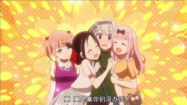 当然,这部番依然没有偏离它的主线,第二天又再次上演了一波高手之间的对决。我们的藤原书记成为了双方交火的子弹。两人都试图让对方先行告白,刚开始辉夜占优,会长一席话又让书记策反,眼看辉夜就要不行时,我们的真男人石上来了一波助攻,辉夜又顺水推舟的圆了回去,两人平手。只可惜我藤原书记成为了牺牲品。