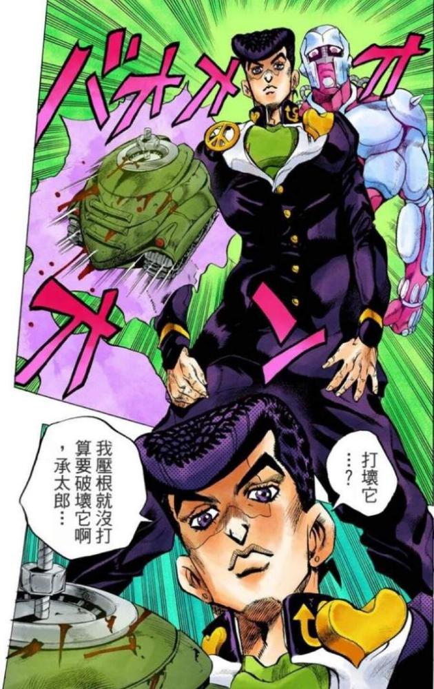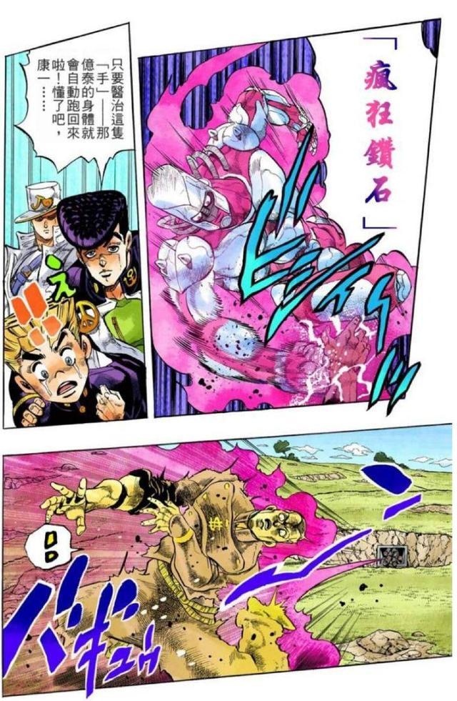 我们知道《JOJO的奇妙冒险》第四部中的主角东方仗助的替身疯狂钻石,拥有修复物体的能力,除了疾病、死亡或者缺少零件这类情况外,仗助能帮助他人治疗绝大多数伤势,哪怕是断肢也不例外。在与音石明的替身辛红辣椒的战斗中,亿泰由于被辛红辣椒的言语激怒,一时冲动切开了地面,导致辛红辣椒得到了地下电缆的电力,在电力充沛的状态下轻易砍断了轰炸空间的手臂。