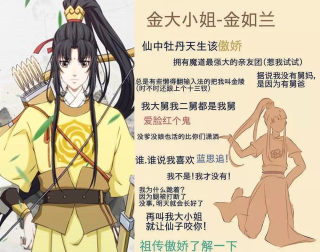 大小姐金凌,字如兰,不愧是大小姐啊,原来他傲娇也是有原因的,因为他是仙中牡丹嘛。不过他的傲娇的确是祖传,毕竟金子轩有过之无不及啊。但是你敢说金凌吗?不敢吧?因为他有魔道最强大的亲友团啊,你惹一个试试?别人说他爱脸红他可不承认,还有再叫他大小姐他可要叫仙子咬死你哦。就算没有舅妈有舅爸,就算没爹没娘也要活得比你们潇洒。