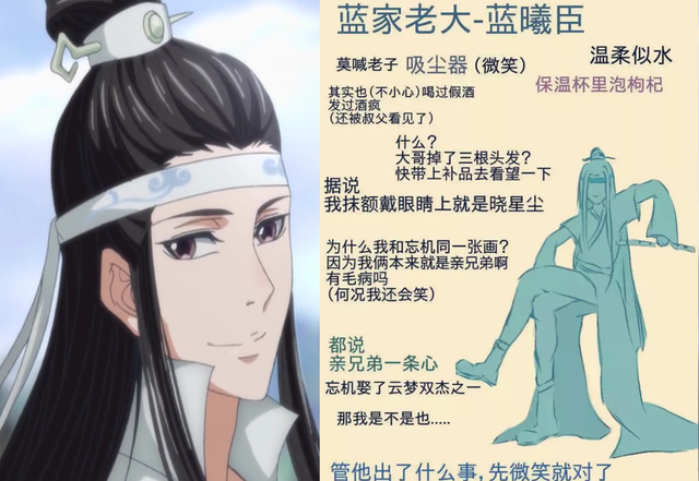 蓝家老大蓝曦臣,也就是泽芜君,平常最喜欢微笑。管他出了什么事,先微笑就对了,简直就是温柔如水啊。不过,曦臣哥哥虽然是读弟机,这个外号还可以接受,但是千万别叫他吸尘器哦,不然可能会忍不住打你哦。他自己也承认,自己其实也不小心喝过假酒发过酒疯,还被叔父看见了。