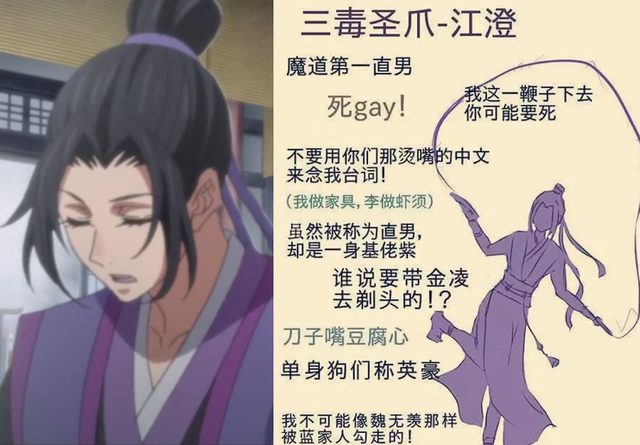 舅舅年轻时为魏婴收拾了不少烂摊子,差点成了个小老头。大家都在努力谈情说爱,只有他在专心搞事业,被誉为魔道第一直男,不过让人好奇地是为什么他老是穿着一身紫色呢?这不得不让人怀疑他是不是真的专心搞事业啊。金凌目前是他的逆鳞,只要谁欺负金凌,那就要剥了他的皮,刀子嘴豆腐心的舅舅简直就是金凌的贴身小棉袄。最后那一句我觉得会被打脸,你们觉得呢?