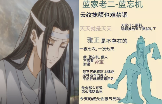蓝家二公子据说是一个连云纹抹额也难禁锢的男子,天天就是天天,一点也不能更改。外表波澜不惊,内心汹涌澎湃,不管什么黑料,总之锅都推给天子笑就对了,反正雅正是不存在的。兔兔那么可爱,怎么能吃兔兔,为什么不能吃只有他自己知道。为什么会对魏婴那样造作的人感兴趣,可能是因为他姓蓝吧。最后一句真的不是大逆不道吗?汪叽你人设彻底崩了。