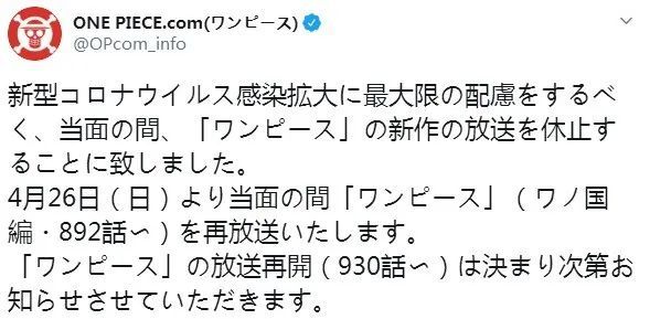 4月20日,《海贼王》、《数码宝贝大冒险:》和《光之美少女》官方都宣布动画将延期播放,具体恢复时间待