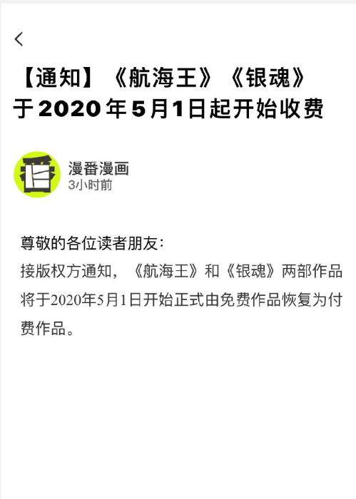 据漫番漫画在微博发布的通知,应版权方要求,《海贼王》和《银魂》两部作品,将于2020年5月1日起,全网正式由免费作品恢复为付费作品。