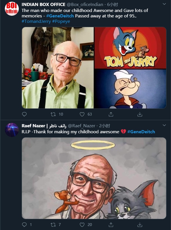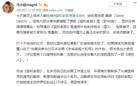 不过,大多数讣闻里选取的《猫和老鼠》图像,和吉恩·戴奇的剧集并非同一版本。当天下午,马小褂老师的一条微博得到了广泛传播,即《猫和老鼠》并非吉恩·戴奇的主要作品,用它来总结戴奇的人生成就,“好比说李安最大的成就是拍了一部《绿巨人》”。